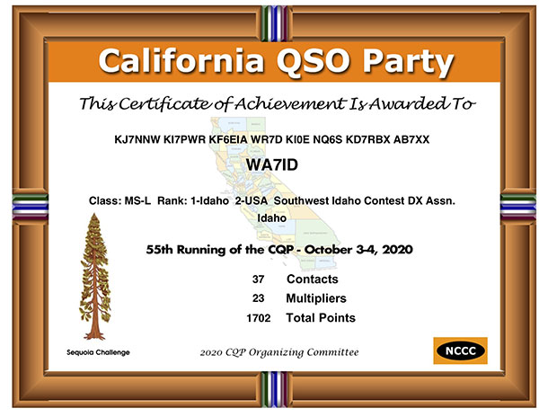 If you participated in the California QSO Party, and submitted your log, you can now print a customized Certificate of Achievement. Both Personal and Team Certificates can be printed, depending on your class of operation.