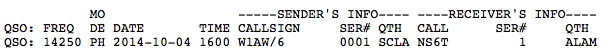 | The exact amount of space between fields is not crucial. Ideally the sent QTH and received QTH should be one of the official 58 4-character California county abbreviations, the official 58 2-character US state and Canadian province abbreviations, or DX — all in the online list.