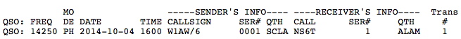 | The exact amount of space between fields is not crucial. Ideally the sent QTH and received QTH should be one of the official 58 4-character California county abbreviations, the official 58 2-character US state and Canadian province abbreviations, or DX — all in the online list.
