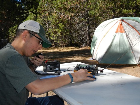 Gabriel Moreno, N6OSB sits outside of his tent at Granite Creek Campground in Madera County operating QRP